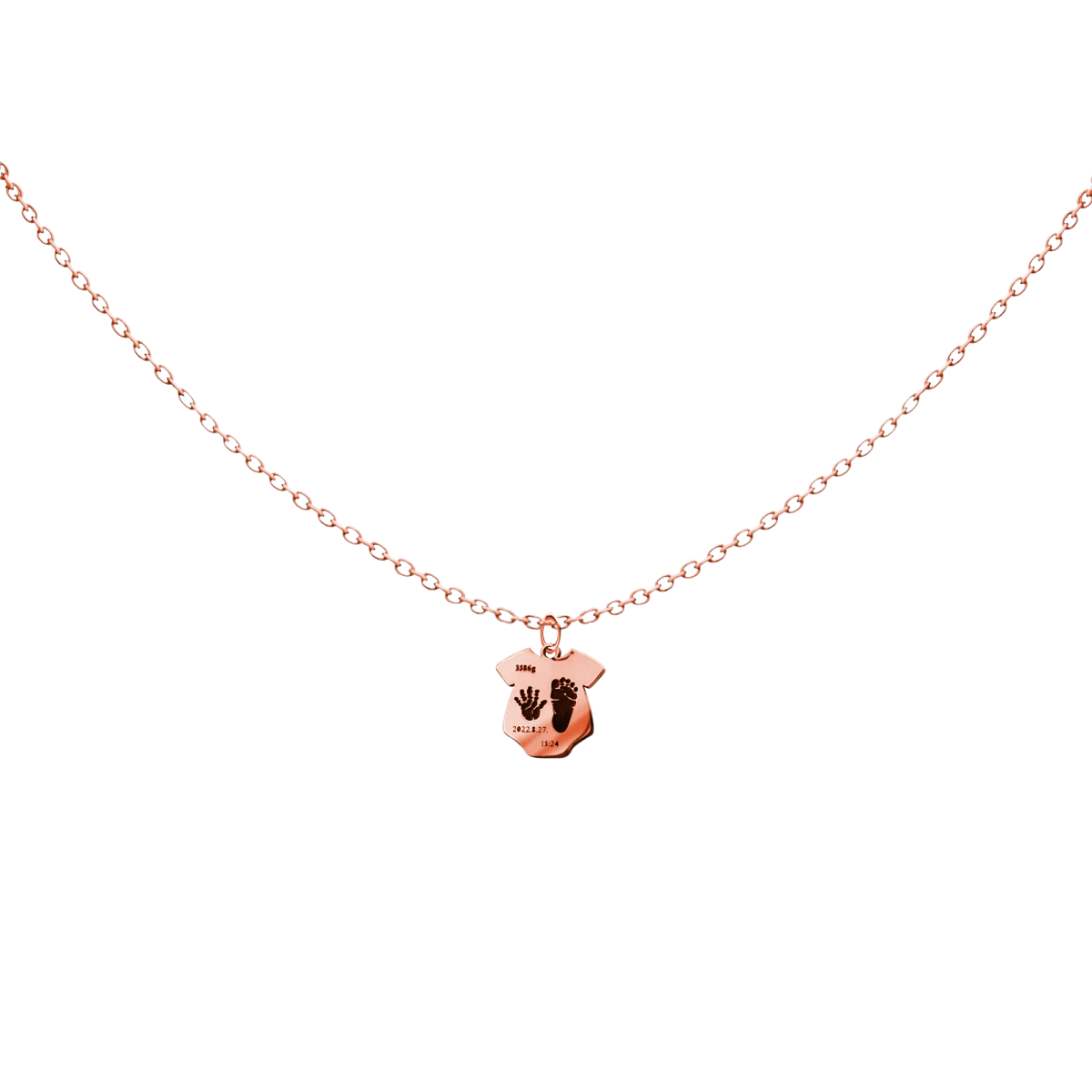 Ein bezauberndes Geschenk für neue Eltern :-) Ein süßer Anhänger in Form eines Babykörpers an einer Halskette aus Rosegold, verziert mit Hand- und Fußabdrücken sowie den Geburtsdaten (Datum, Zeit, Gewicht). Teile uns die notwendigen Daten in einem Kommentar mit! Die Größe des Anhängers: 12x12 mm.