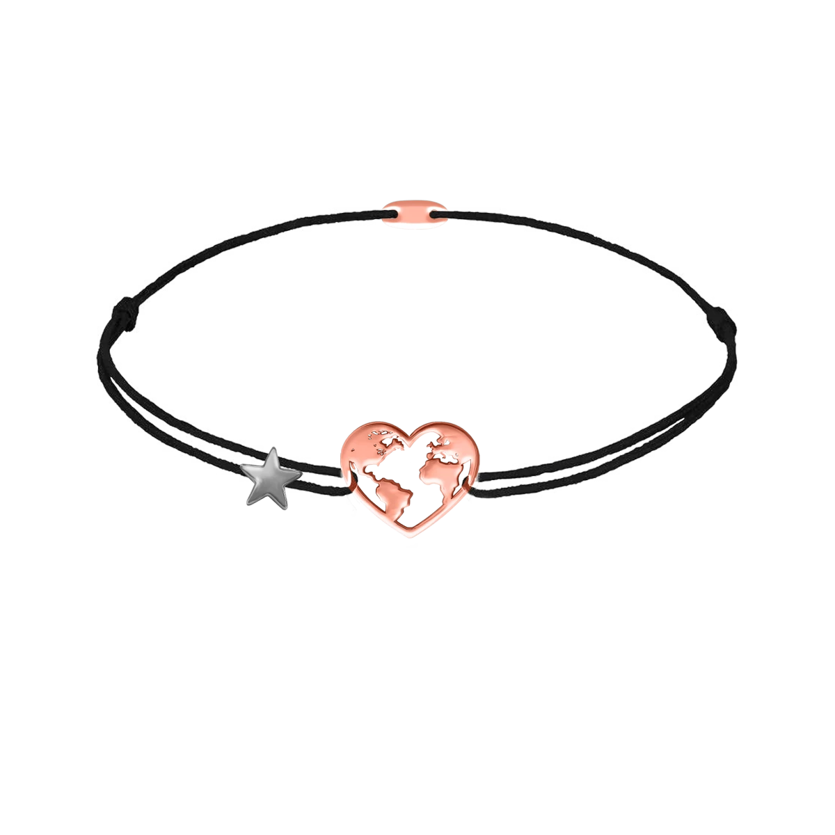 Globus in einem Herz mit Hämatitstern Roségold 585 Fadenarmband
