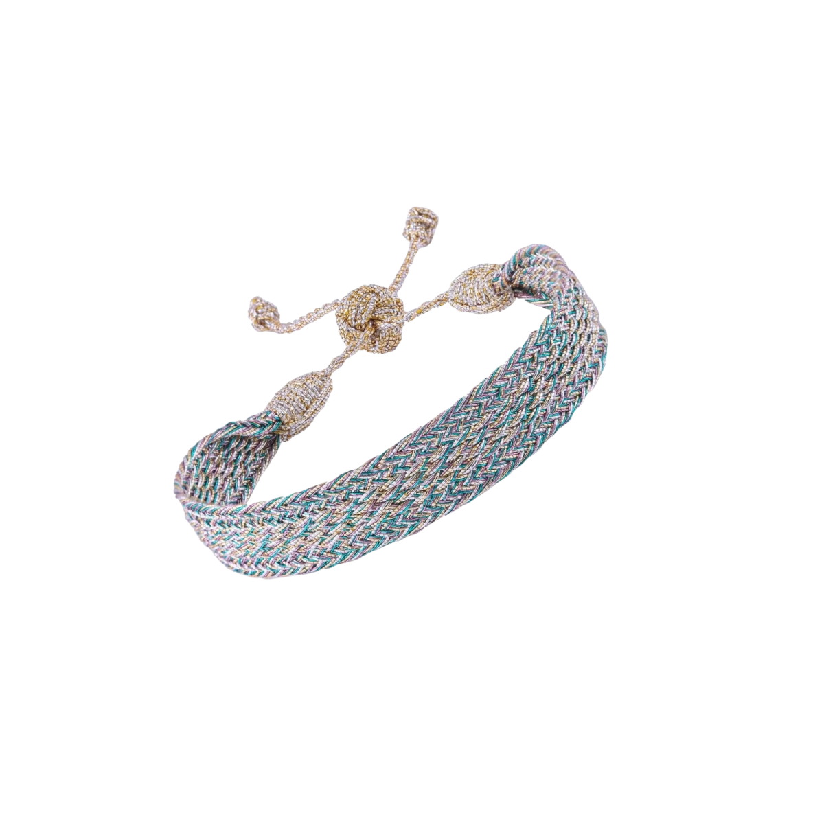 Handmade bracelet, with a production time of more than 3 hours. The dominant color is Tiffany Blue, whose fresh and elegant turquoise shade creates a unique and captivating effect. The material is called Sfifa in Arabic, made from the weaving of traditional golden threads. With its enchanting range of colors, this piece will brighten up your look. The fabric is water-resistant; however, for longer durability, please avoid wearing it while showering, doing household chores, or exercising. Thanks to the sliding knots, the bracelet size is adjustable between 14 and 23 cm.