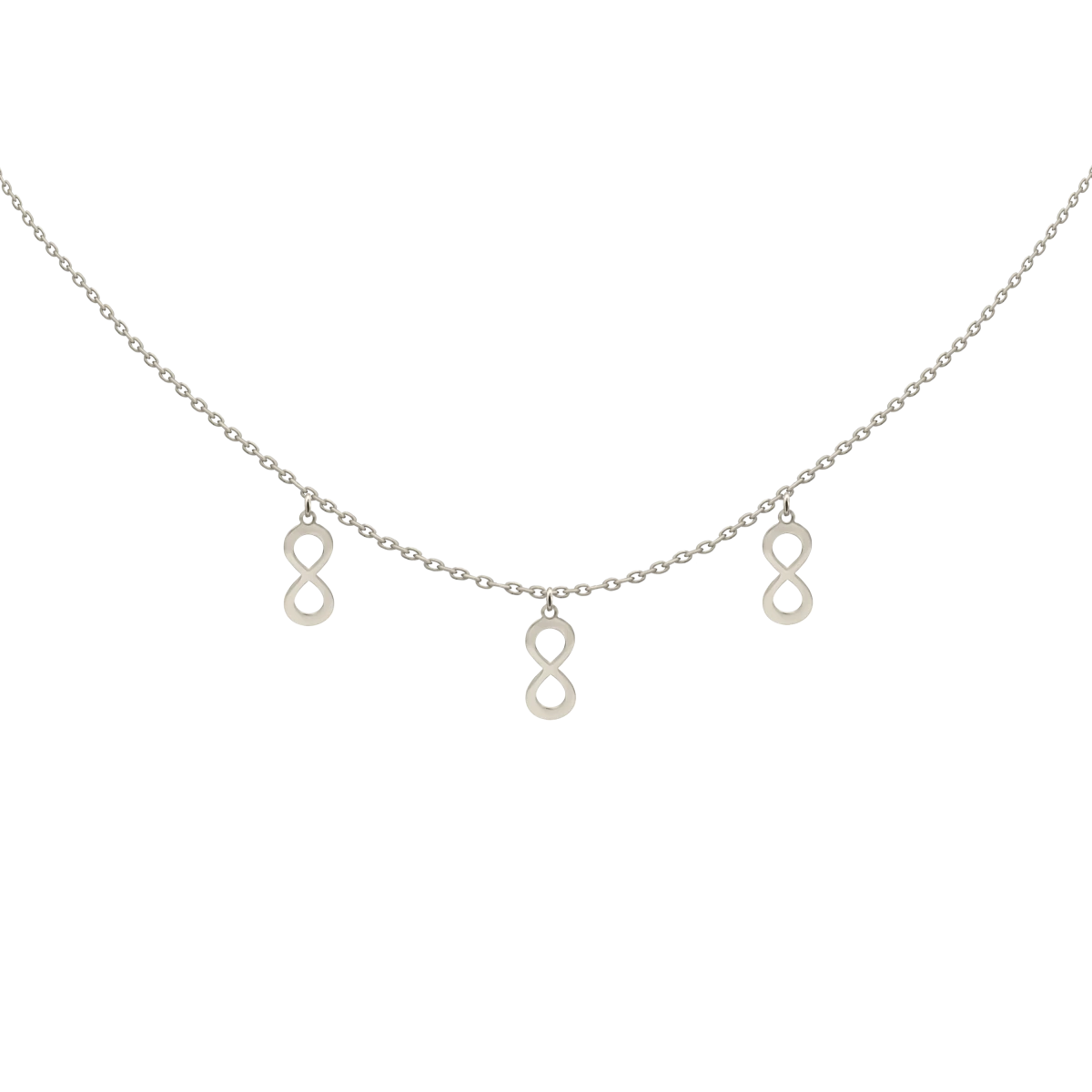 ZILIA Halskette mit drei schwingenden Unendlichkeitssymbolen. Zarte, moderne Eleganz und tiefe Symbolik für ewige Liebe, grenzenlose Möglichkeiten und Stärke.