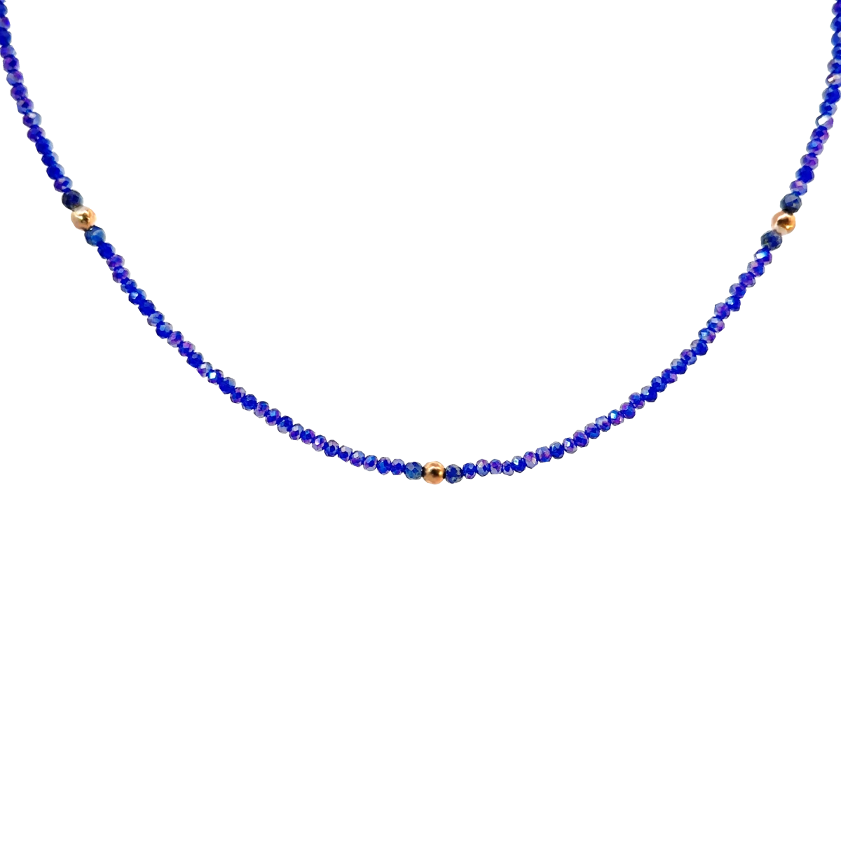 Einzigartige, handgefertigte Halskette mit Lapislazuli und 925er Feinsilberfaden, überzogen mit Roségold. Für Liebhaber von wirklich trendigen Stücken. Das Funkeln der Mineralien macht das Outfit noch heller und bunter.