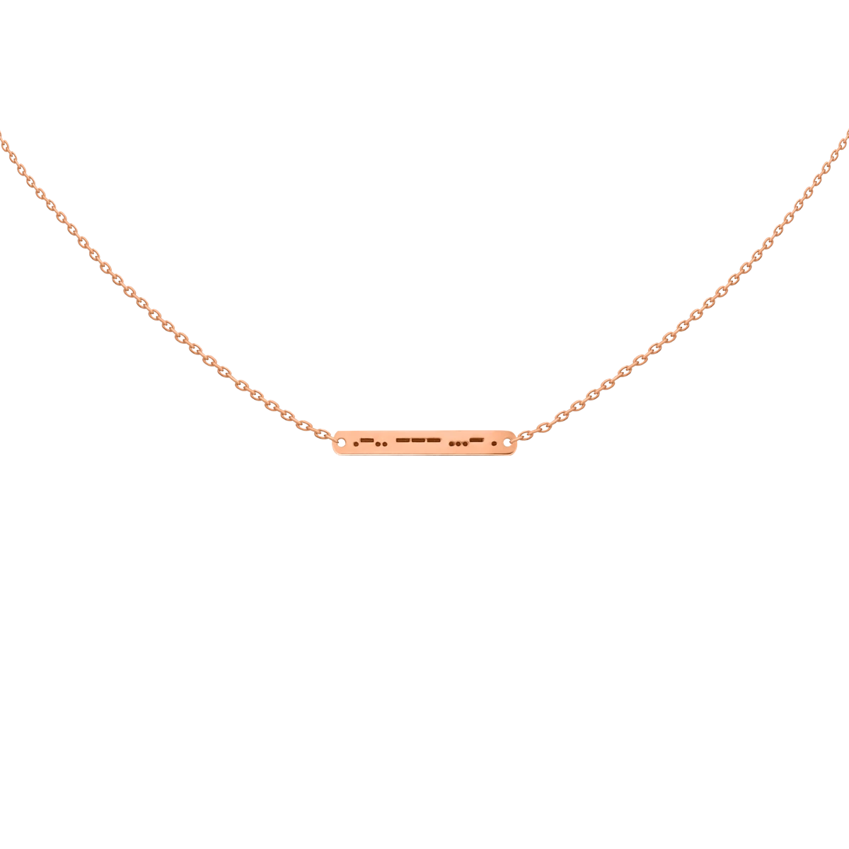 Verleihen Sie Ihren Gefühlen einen Hauch von Geheimnis mit unserer außergewöhnlichen Halskette, die das Wort „LOVE“ in Morsezeichen verbirgt. Die elegante, längliche Rosegoldplatte trägt die geheimen Punkte und Striche als stilvolle Botschaft der Liebe – perfekt als besonderes Geschenk oder als persönliches Schmuckstück. Dieses trendige Morsecode Schmuckstück vereint modernes Design mit tiefer Bedeutung und macht es zum idealen Accessoire für alle, die das Besondere suchen. Entdecken Sie ein einzigartiges Symbol der Liebe, das ohne Worte auskommt und dennoch alles sagt.