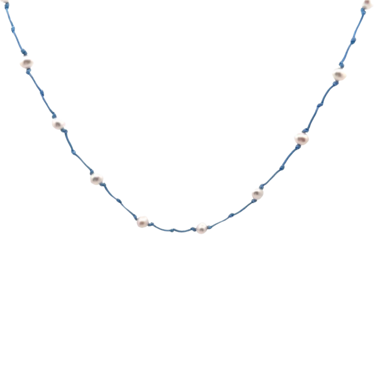 Handgeknüpfte Halskette auf farbigem, unzerbrechlichem Faden aufgezogen, mit 15 Süßwasserperlen, Verschluss aus Silber 925. Mach dich mit uns bereit für den Sommer, genieße die Sonne und zeige deine neue, modische Halskette, die du mit einem geknüpften Armband oder Fußkettchen kombinieren kannst - auch in einer anderen Farbe!