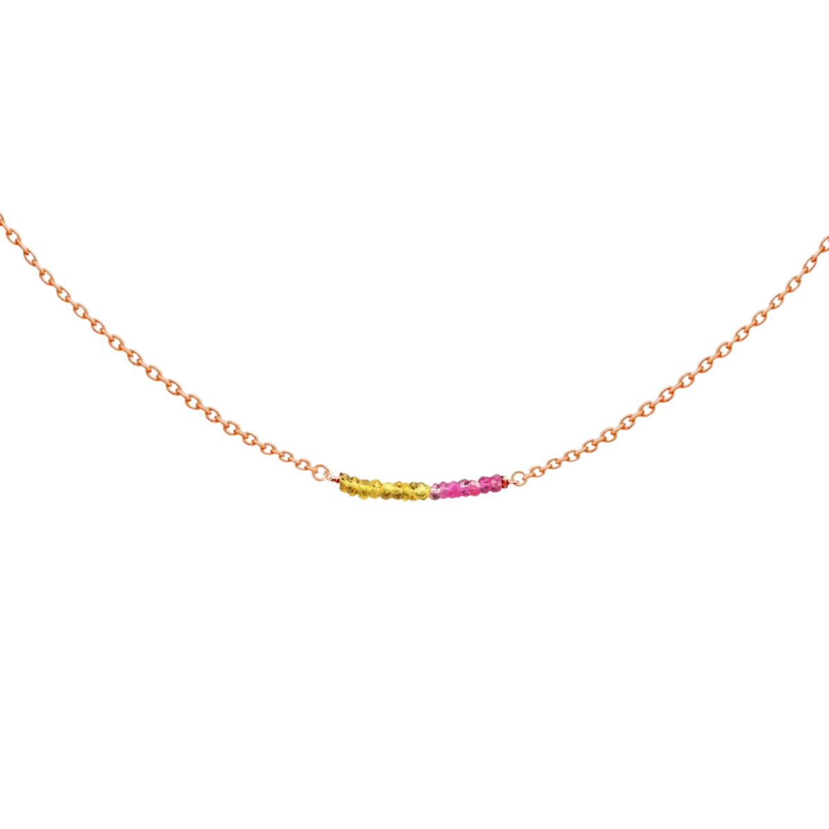 Du kannst ein auffälliges Stück unserer Edelsteinkollektion mit dieser schönen Halskette tragen. Das harmonische Zusammentreffen von gelbem Saphir und rotem Rubin in einem Schmuckstück, das das Feuer in dir beleben kann. Wir empfehlen es als Freizeitkleidung.