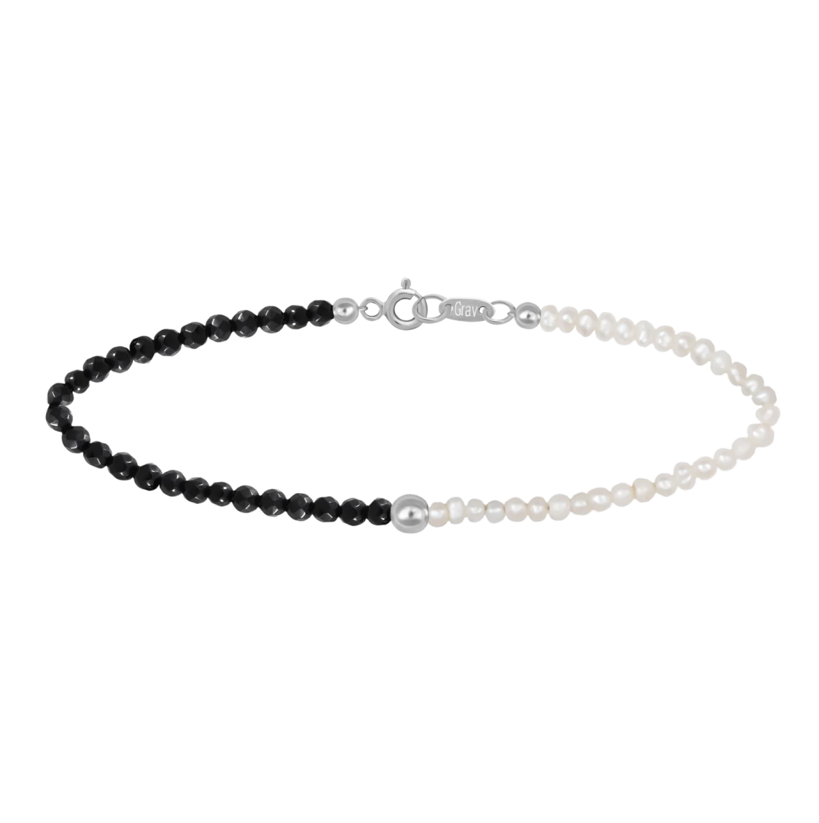 Eine Kombination aus facettiertem schwarzem Onyx, einer kleinen Süßwasserperle und einem Stück Silberperle in einem klassischen, aber wirklich stilvollen Schmuckstück. Der Schlüssel zu einem perfekten lässigen und festlichen Look. Trage es in einem Set mit einem Halskettenstück aus der Kollektion und das Ergebnis wird für sich selbst sprechen!