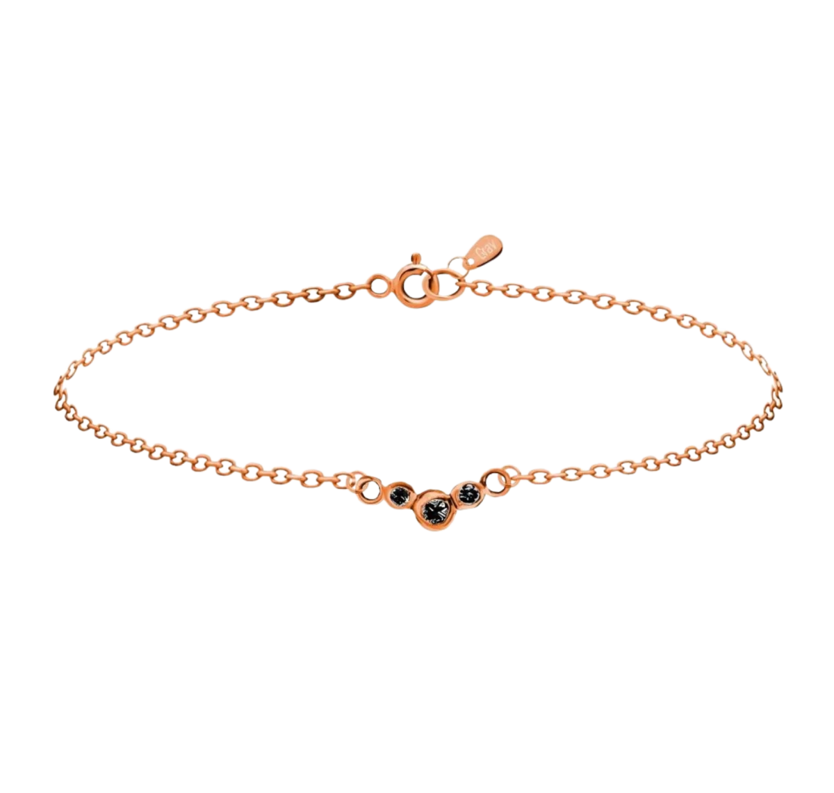 Das ZILIA Armband aus hochwertigem Rosegold vereint moderne Eleganz mit zeitloser Raffinesse. Drei schwarze Zirkonia Edelsteine setzen stilvolle Akzente und verleihen jedem Outfit einen dezenten Hauch von Luxus. Das filigrane, handgefertigte Design sorgt für ein angenehmes Tragegefühl und macht dieses Rosegoldarmband zum perfekten Begleiter für besondere Anlässe oder den Alltag. Die Zirkonia Steine mit einer Größe von 1 bis 2,5 Millimetern unterstreichen die exklusive Ausstrahlung dieses Schmuckstücks.