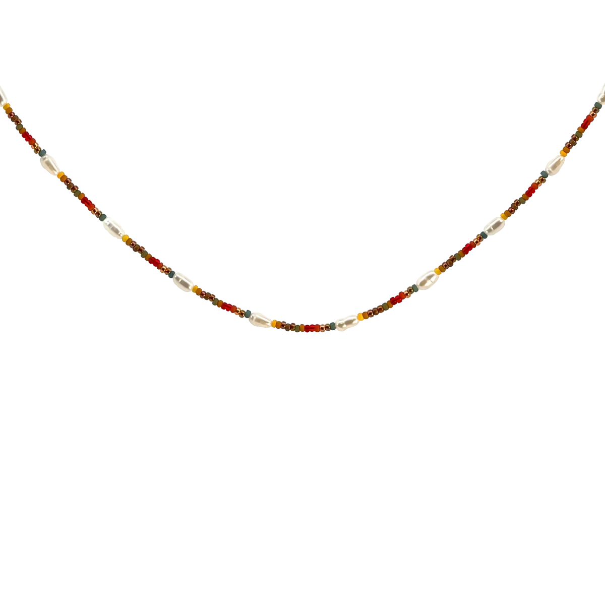 Discover the magic of autumn with this youthful and vibrant necklace, inspired by the warm tones of the season! The carefully selected design beads – shimmering shades of golden brown, yellow, and reddish seed beads – blend harmoniously with delicate, rice-shaped white freshwater pearls, evoking the colors of falling leaves and sunlit nature. This necklace is not only elegant and naturally beautiful but also practical – the adjustable chain extender allows you to easily find your perfect fit, ensuring comfort and a flawless look every time.