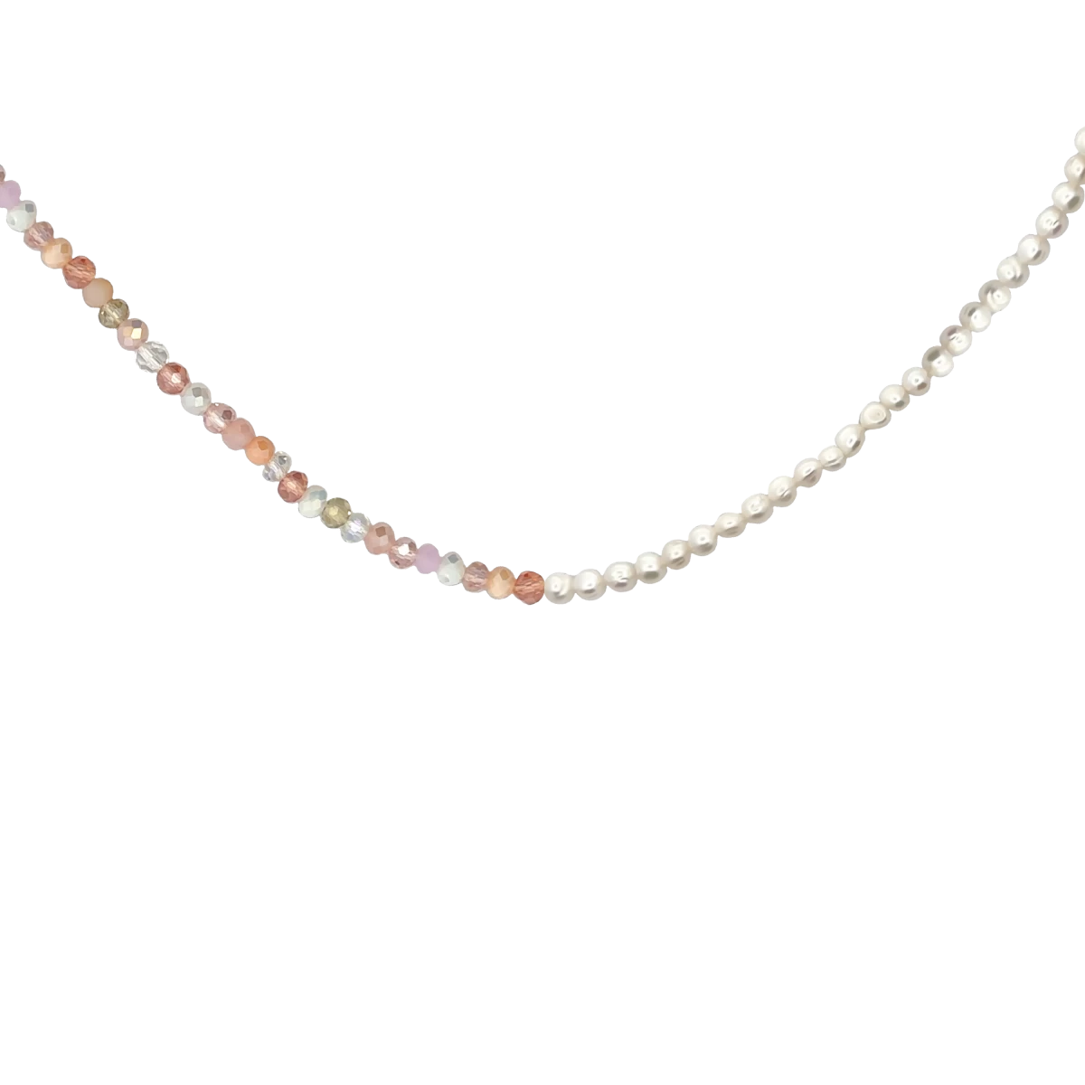 Perlenkette mit rosa und weißen Kristallen Gelbgold vergoldetes 925er Silber eleganter Halsschmuck