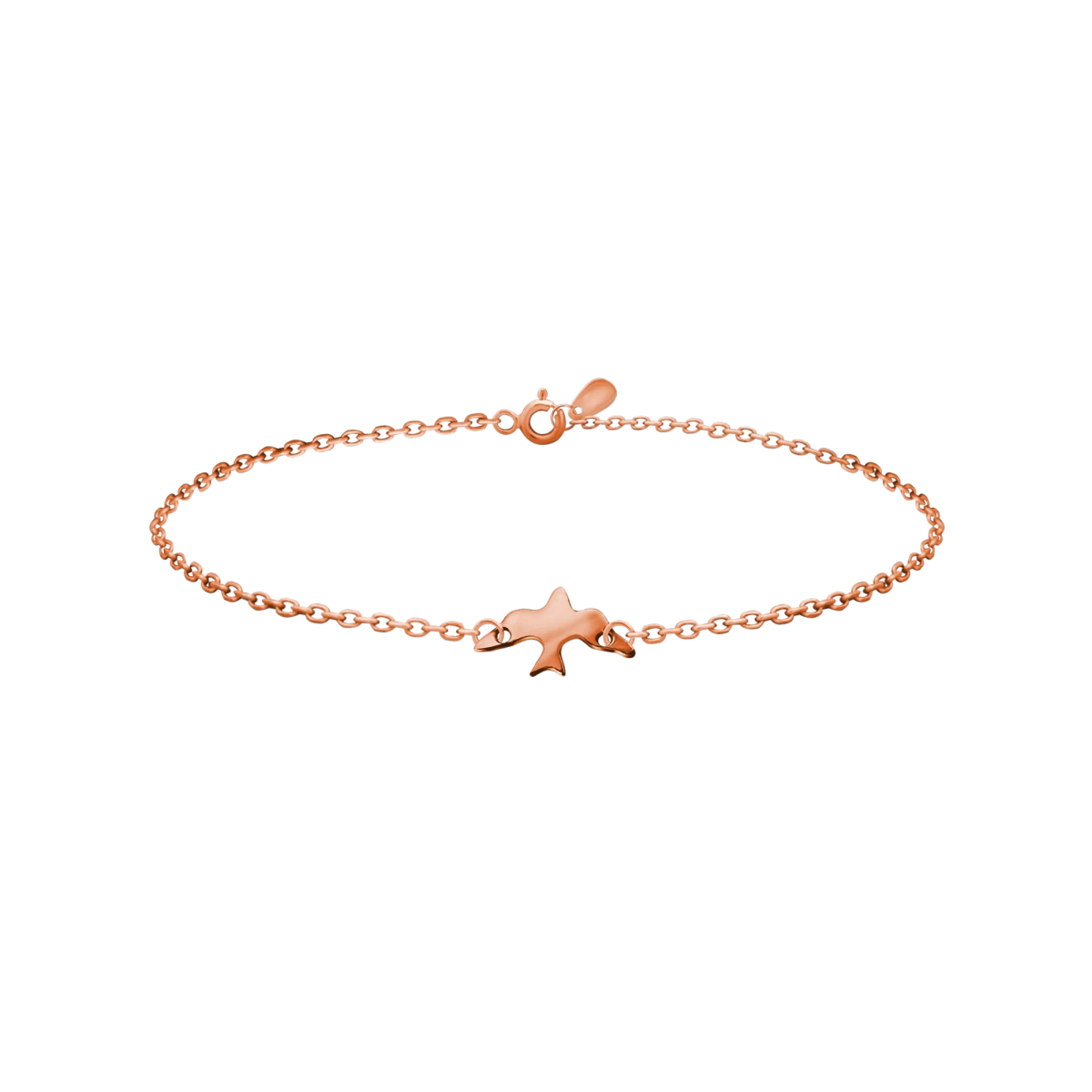 Das Motiv des fliegenden Vogels ist ein häufig verwendetes und beliebtes Thema in der Schmuckherstellung, das Freiheit, Höhe und Schönheit symbolisieren kann. Dieses zarte und elegante Stück ist im minimalistischen Stil aus Rosegold gefertigt und kann eine perfekte Wahl für besondere Anlässe sein, aber es eignet sich auch für den täglichen Gebrauch. Die Größe des Anhängers: 14x8 mm.