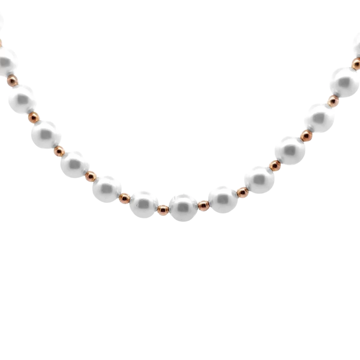 Eine erstaunliche Geschenkidee für modebewusste Frauen: eine handgefertigte Halskette, deren jedes Detail aus hochwertigen Süßwasserperlen und mit brillantem 18-karätigem Roségold überzogenen Silberkugeln besteht, was ein einwandfreies Aussehen garantiert. Der Durchmesser der Perlen: 8-9 mm, und der Durchmesser der vergoldeten Silberkugeln: 4 mm.