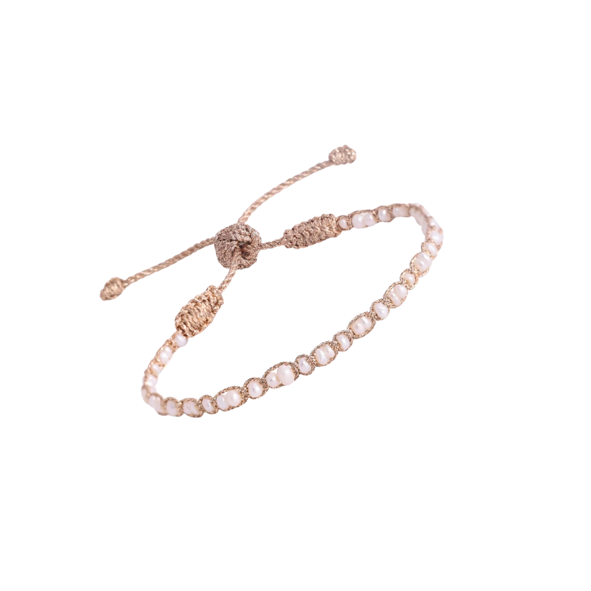 The Maya Anar bracelet blends the refined elegance of freshwater pearls with peach and walnut-toned Skalli threads. This warm, summery color combination evokes the spirit of the Moroccan coast, adding a fresh and lively touch to any outfit. The handwoven craftsmanship and the subtle shine of the pearls create a modern yet timeless accessory. With its adjustable sliding knot, the bracelet fits comfortably on wrists 14–23 cm in size. The Maya Anar is a stylish, versatile choice for everyday wear or summer occasions, combining modern flair with effortless elegance.