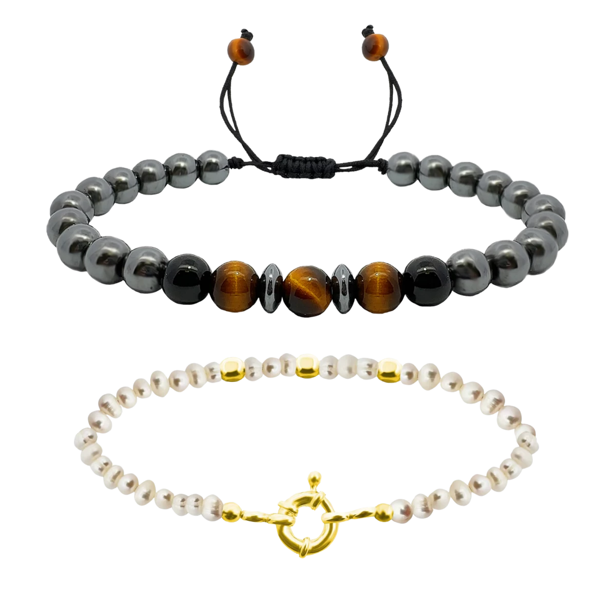 Entdecken Sie unser exklusives Armband-Set für Paare und Freunde, die Stil und Harmonie gemeinsam erleben möchten. Das Herrenarmband überzeugt mit einer Kombination aus Tigerauge, schwarzem Onyx und Hämatit, die innere Ruhe und Ausgeglichenheit fördern. Für Damen besticht das Armband durch edle Süßwasserperlen und ein auffälliges Karabiner-Element aus 14 Karat gelbvergoldetem 925er Silber, das pure Eleganz verkörpert. Dieses Set ist das perfekte Geschenk für besondere Verbindungen und bringt einen Hauch Luxus in jeden Alltag.