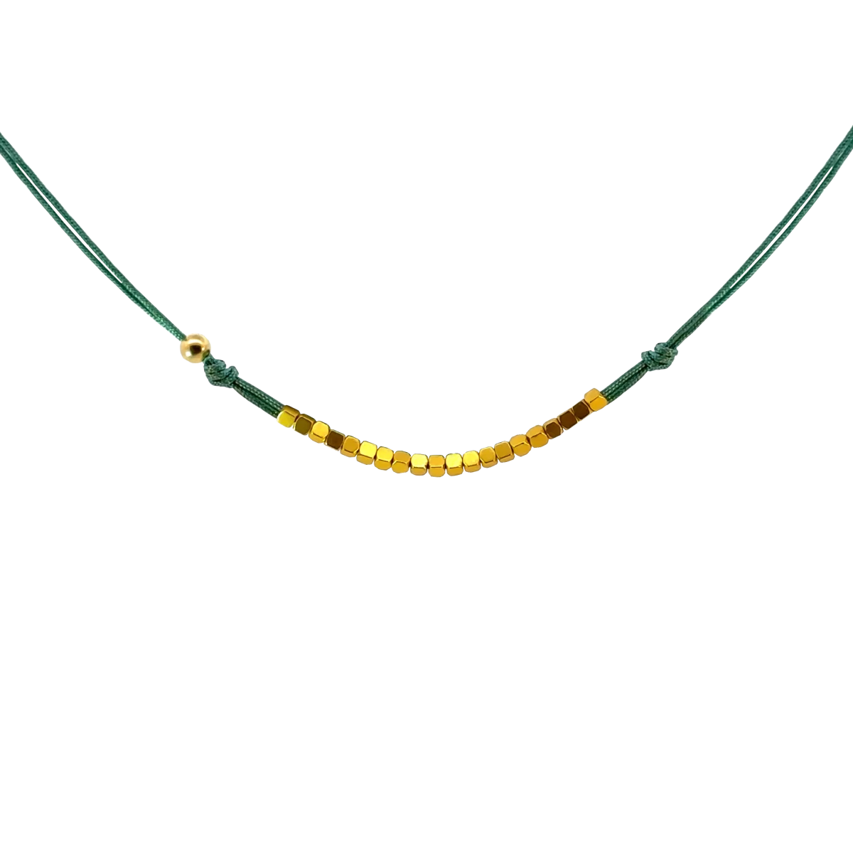 Brighten up your everyday look with this green braided necklace, adorned with elegant gold-tone hematite cubes! The adjustable chain extender ensures a comfortable fit. The harmonious combination of green braid and shiny gold hematite creates a unique, eye-catching style.